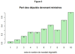 La figure 6 indique aussi le nombre absolu de personnes concernées. Ainsi, il est vrai que plus de 70% des députés ayant rempli dix mandats ont été ministres, mais cela ne concerne que 5 personnes. Seuls deux députés ayant franchi la barre des dix mandats n’ont pas été ministres. La population étant donc très limitée, les proportions sont à prendre avec précaution.