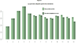 La figure 7 nous donne des informations pour répondre à la première interrogation ; elle indique, dans la durée de la législature, la part que les membres des gouvernements ont passé en tant que ministre. Autrement dit, si une personne est ministre de tous les gouvernements d’une législature, la durée de son mandat ministériel est de 100% du temps de la législature. La moyenne pour l’ensemble des ministres concernés donne une perspective générale.