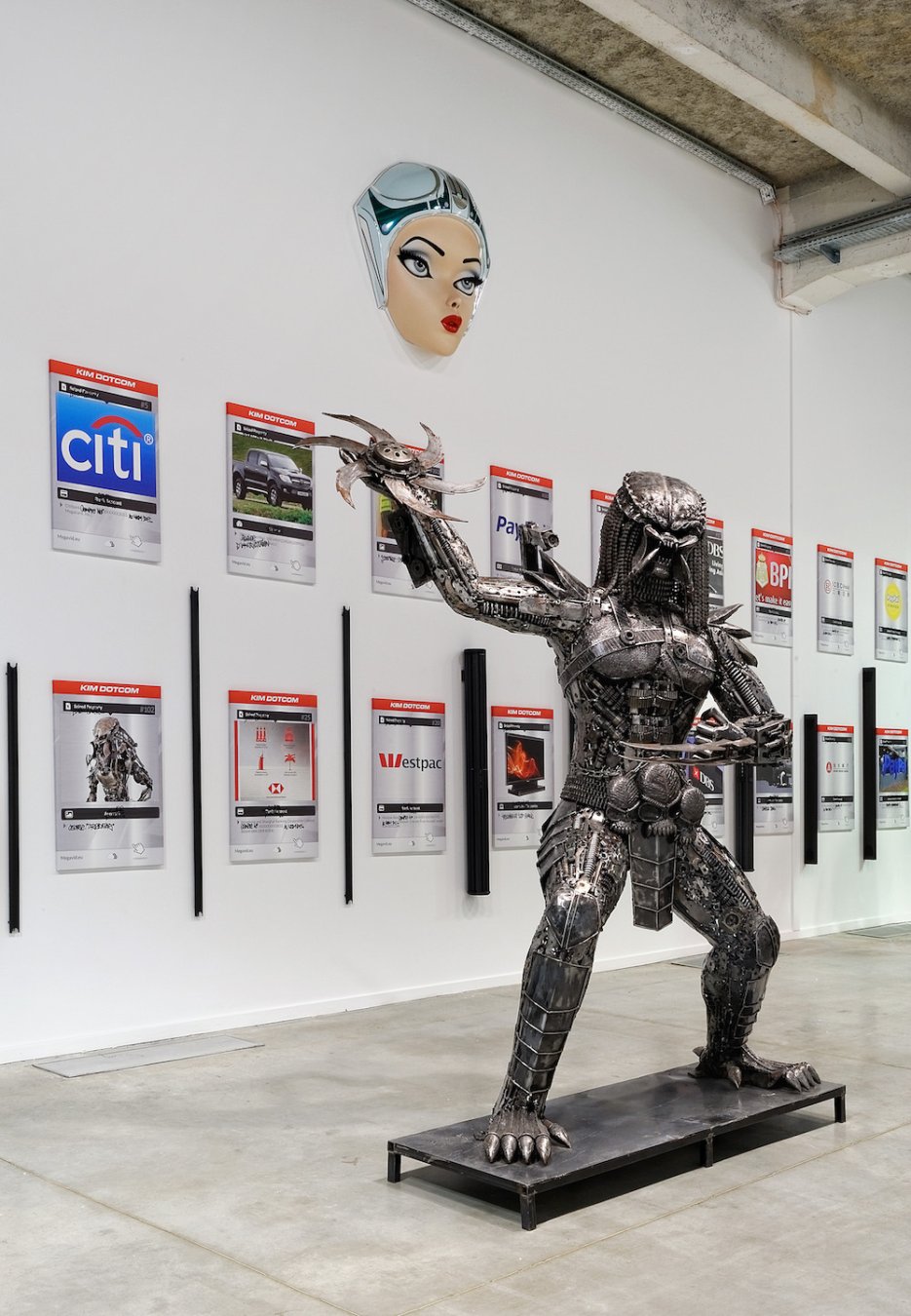[1] Pourtant, peu d’objets artistiques égalent la violence visuelle de certains des objets (décoratifs ? fétiches ?) de la collection de « King Dotcom » – qu’il s’agisse de la reproduction grandeur nature de la créature de Predator ou de l’étrange tête de pin-up cosmonaute en aluminium, dignes des décorations de foire du trône les plus kitsch. Dans les reconstitutions faussement fidèles de Denny, l’art signale sa présence en négatif via la disposition des pièces dans l’espace (les nombreux écrans plats de « King Dotcom », alignés les uns derrière les autres, par ordre de taille, ne seront pas sans évoquer la sculpture minimaliste), et, finalement, s’affirme comme une forme de « triche » possible face aux formes figées de l’industrie de la culture, et qui impose de repenser sans cesse les règles de son exercice.