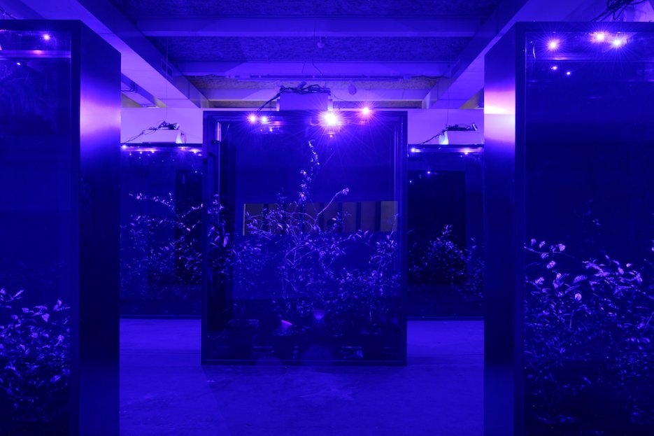 Par conséquent l’exposition n’invitait pas tant à nous interroger sur ce qui peut (encore) être fait, mais plutôt à déterminer ce qui nous reste. Il nous reste le détournement et la transformation des objets existants, comme le montrait l’installation exubérante de Katja Novistkova, (Patterns of Activity) qui n’hésite pas à transformer des balançoires pour bébés en cyborgs ou en éléments extraterrestres. Il nous reste l’humour, très certainement, avec les tableaux féministes post-de Chirico d’Avery Singer ou la collaboration d’Andrea Hamilton et Julie Verhoeven [6] (Fruity Seating, au MAC Lyon) ; la manipulation jouissive des systèmes de perception qui s’opère dans les espaces à la fois bureaucratiques et intimistes de Laura Lamiel (Deux cellules). Il reste en fin de compte le pur ravissement, conjugué à la conscience de la fragilité des écosystèmes grâce au magique Mesk-ellil d’Hicham Berrada, probablement l’une des plus jolies pièces de la Biennale, par un des jeunes artistes actifs en France les plus intéressants, que l’on avait déjà remarqué au MAC/VAL pour sa vidéo Présage (2013). Mesk-ellil, jardin dans la pénombre, où poussait une variété de jasmin qui ne s’ouvre que la nuit, ressemblait à un univers sous-marin. Il représentait à la fois un appel au renouvellement de nos capacités d’émerveillement face aux beautés de la « nature », et vis-à-vis de l’ingéniosité et la poésie de l’activité technique et artistique humaines.