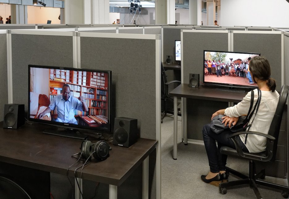 Cette perfection formelle serait même devenue lassante sans les quelques contrepoints apportés par le faux jeu vidéo d’une facture volontairement crue, presque D.I.Y., de David Shrigley (Start/Finish, 2015), ou encore l’étonnamment simple Traditional Repair, Immaterial Injury (2015) de Kader Attia : des agrafes de fer représentant les points de suture qui refermeraient une fissure du sol à la Sucrière. Gracieusement intégrée au site et à la conception d’Attia de l’art en tant que processus réparateur, elle annonçait avec une grande modestie la deuxième œuvre d’Attia présentée à la Sucrière, Les Oxymores de la raison (2015). Composée de dix-huit interviews vidéo avec des spécialistes de la vie psychique de toutes catégories (psychanalystes, guérisseurs, philosophes, etc.), l’installation offre différents points de vue, du Nord et du Sud, sur le traumatisme. De cette œuvre absolument magistrale, on retient peut-être avant tout un métissage des différentes approches à la psychopathologie, les vidéos permettant d’établir des relations entre les pratiques dites traditionnelles et celles qui se revendiquent comme modernes. La Biennale renvoyait ainsi l’image d’univers et de mondes absolument interconnectés, dans l’espace comme dans le temps, géographiquement et historiquement.