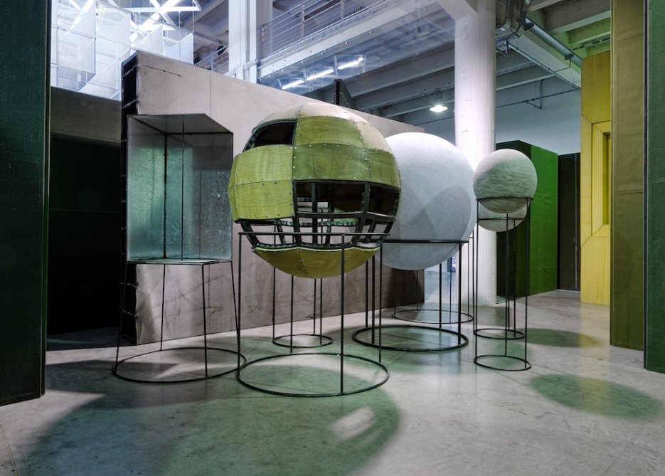 L’installation de l’artiste chinois Liu Wei, qui ouvrait l’exposition à la Sucrière, introduit bien les ambivalences de cette vie moderne. Les étranges structures qui construisent comme un labyrinthe dans lequel on ne se perd pas tout à fait puisqu’on est libre d’en sortir sans trop d’embarras, évoquent autant des maquettes que des ruines ou des châssis dans un atelier ; les sortes de globes arrangés au cœur de l’installation nous placent dans la position d’un démiurge ou d’un savant contemplant les représentations du monde, tandis que les grands rayons nous donnent au contraire le sentiment d’être des pions dans une des bibliothèques infinies de Borgès. La toile vert foncé qui recouvre une grande partie de ces éléments au statut hybride entre objets et fragments architecturaux, rappelle les dictatures militaires passées, présentes, et à venir. On se sent tantôt trop grande ou trop petite dans cette installation dont l’indétermination fait la force, à la fois confortable, feutrée et oppressante, qu’on regrettera d’avoir quittée trop vite tout en s’y étant sentie mal à l’aise.