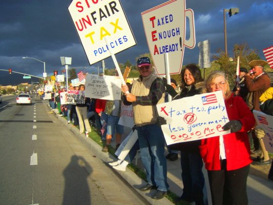 La tirade de Santelli ne fait que donner un nom à un courant de sentiments anti-Obama répandus depuis la campagne de 2008. Une partie de la droite avait déjà traité le candidat démocrate de « socialiste ». Le plan de relance (« stimulus »), proposé par son équipe économique dès janvier 2009, avait attiré les foudres de Rush Limbaugh, le célèbre animateur de talk-radio conservateur, qui en avait dénoncé le gâchis (notamment parce qu’il finançait des projets aidant les campagnes électorales de certains représentants et sénateurs). L’idée d’une Tea Party « 2009 » fait alors fureur dans certains milieux conservateurs et libertariens. Comme journée d’action, ils choisissent le 15 avril, la date-limite avant laquelle les Américains doivent payer leurs impôts. Ce jour, quelque 750 réunions ont lieu un peu partout dans le pays, dans les grandes comme dans les moyennes villes. On parle d’un mouvement populaire, mais ces manifestations obtiennent un soutien important de la part d’associations conservatrices. Surtout, elles obtiennent un débouché médiatique, grâce à la chaine conservatrice Fox, qui leur consacre une journée entière de reportages. Encore une fois, le plan de relance est visé.