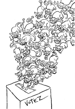 J’ai utilisé un personnage qui est le chat. Le chat a toujours été un symbole utilisé par les anarchistes, par les libertaires… Le chat est indépendant. Ce n’est donc pas gratuit, mais en même temps le but était de prendre du recul et de se moquer un peu – même si la situation dramatique ne donnait pas envie de rigoler. C’est un peu comme avoir un fou rire pendant un enterrement. Ce sont toujours ces moments de tension là où l’on a un fou rire nerveux. Le but c’était graphiquement de rire, même si ce n’était pas le moment. Je recevais beaucoup de messages de personnes qui regardaient mes dessins, qui me disaient : « Continue, ça m’évite de prendre du Xanax. » J’ai continué parce que j’en avais besoin – mais si en plus je pouvais être antidépresseur, c’était l’idéal pour moi.