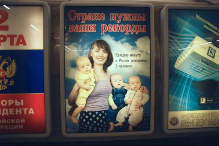Moscow subway advertisement: “The country needs you to break records. In Russia, three babies are born each minute.”