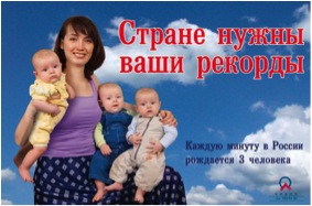 Moscow subway advertisement: “The country needs you to break records. In Russia, three babies are born each minute.”