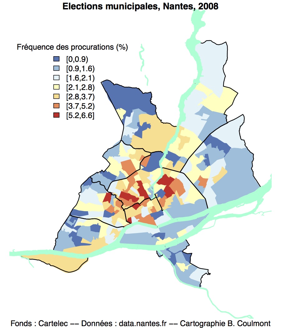 La carte suivante représente le taux de procuration, par bureau de vote, à Nantes lors des municipales de 2008, qui ont vu la réélection de Jean-Marc Ayrault. Les frontières des quartiers administratifs sont aussi représentées, par un trait noir. À Nantes, les quartiers qui ont recours à la procuration sont les espaces du centre ville, que les auteurs de Sociologie de Nantes [10] décrivent comme ceux de la bourgeoisie. Les zones périphériques utilisent beaucoup moins cette possibilité. Un examen plus précis montrerait, comme le souligne l’ouvrage précité, que les quartiers administratifs de Nantes regroupent sous un même intitulé des « sous-quartiers » socialement différents, rendus visibles à l’échelle des bureaux de vote.