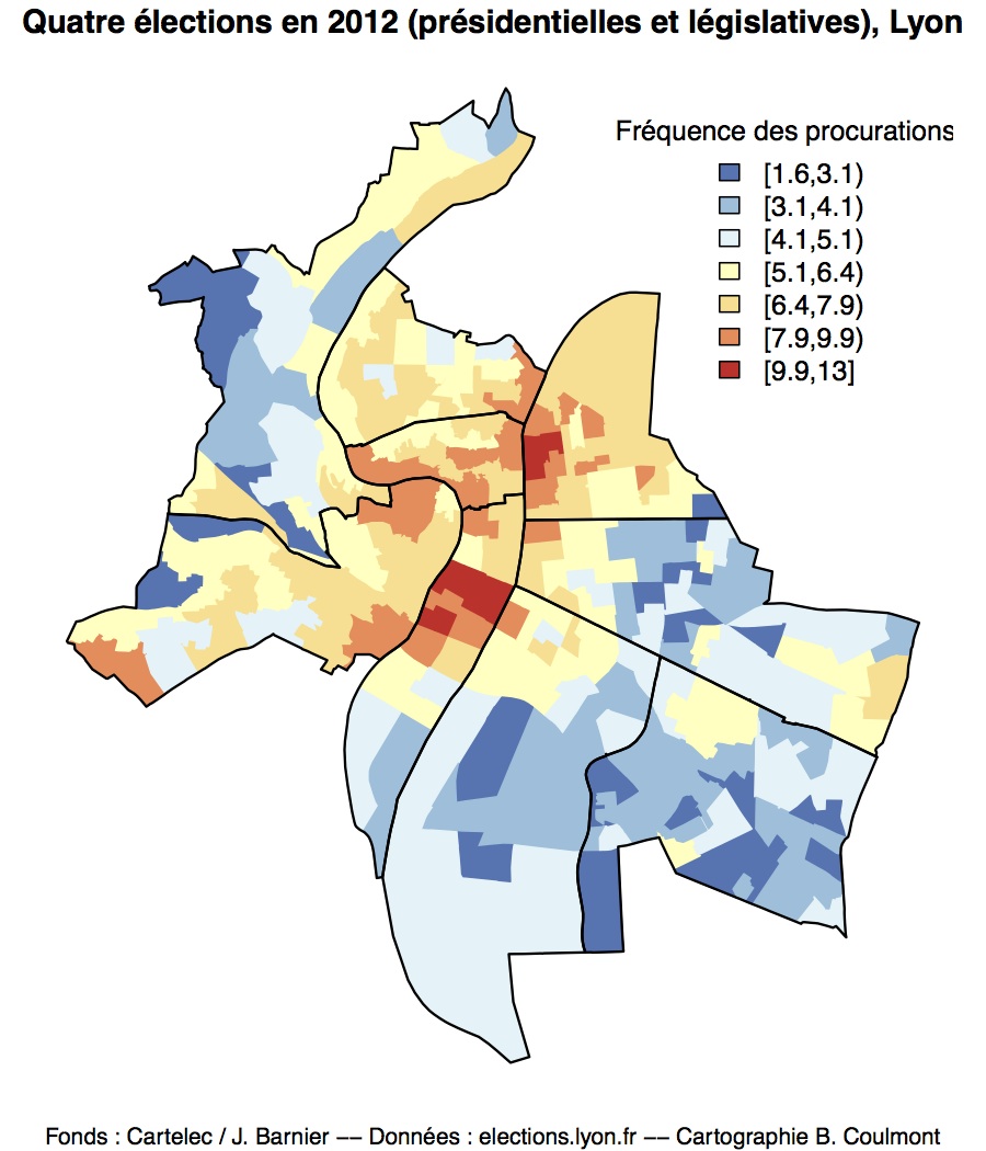 Une géographie similaire apparaît aussi à Lyon : les votes par procuration sont plus fréquents dans les quartiers bourgeois du centre ville. La carte suivante montre, pour Lyon, la fréquence moyenne des votes par procuration lors des quatre élections de 2012 (les deux tours des Présidentielles et les deux tours des Législatives qui ont suivi). Agréger ainsi plusieurs élections permet de mieux faire apparaître des régularités.
