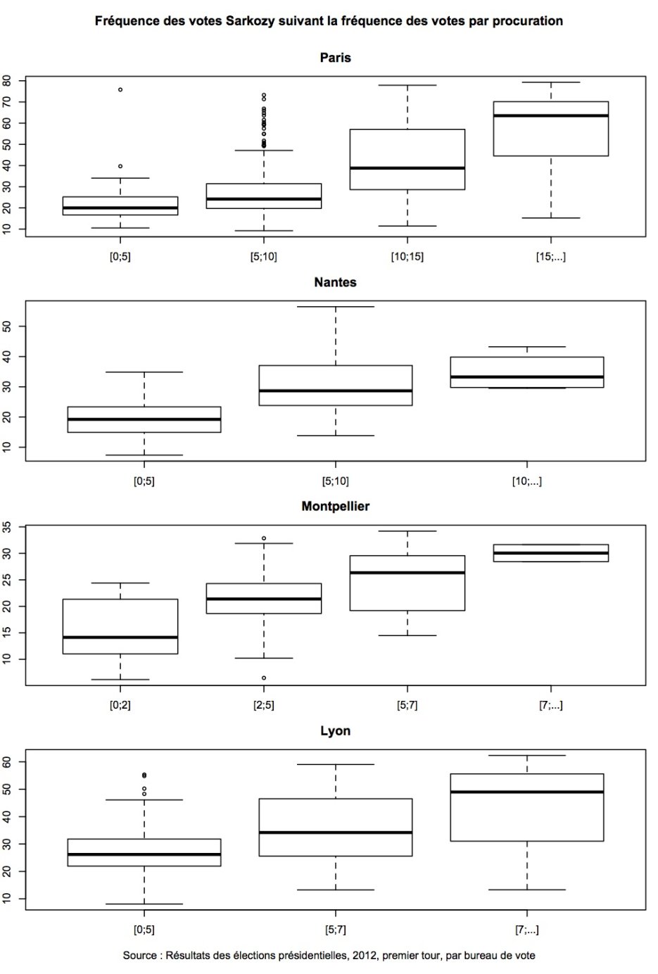 Le vote par procuration (repéré à l’échelle du bureau de vote) apparaît donc a priori comme un vote bourgeois, ce qu’illustre la corrélation positive entre votes par procurations et votes « Sarkozy » à la présidentielle de 2012. Plus les votes par procuration sont fréquents, plus les votes en faveur de Nicolas Sarkozy sont fréquents. L’observation ne portant que sur des bureaux de vote, il s’agit de ce que l’on appelle une corrélation écologique, et non sur les votes individuels, il ne faut pas en conclure que les votes par procuration sont des votes pour Nicolas Sarkozy, mais simplement qu’ils sont plus fréquents dans les bureaux « de droite ».