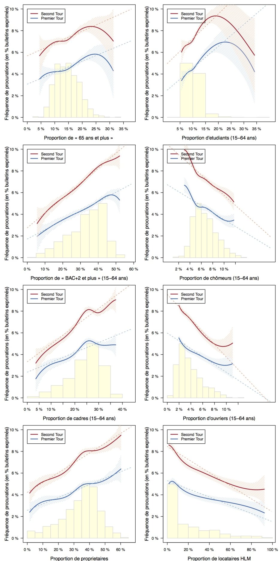 À Paris (aux élections présidentielles de 2007), à l’échelle du bureau de vote, la fréquence de la procuration est positivement corrélée à la proportion de personnes âgées : l’impossibilité de se déplacer est une bonne raison de faire une procuration. Il en va de même avec la proportion d’étudiants, même si les (rares) bureaux de votes comprenant plus de 15% d’étudiants se comportent inversement. Les corrélations sont positives entre la proportion de cadres, la proportion de diplômés du supérieur, la proportion de propriétaires : la classe électoralement mobilisée est aussi une classe mobile. Et négatives avec la proportion de chômeurs, la proportion d’ouvriers et la proportion de ménages résidant en HLM.