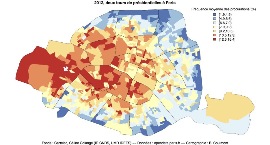 Il serait possible de multiplier les exemples. Arrêtons-nous à Paris. En 2012, les votes par procuration apparaissent très répandus dans les 5e, 6e, 7e, 8e et 16e arrondissements, et comparativement beaucoup plus faibles dans les 19e et 20e arrondissements. La « ceinture » de HLM, située à proximité du périphérique, aux frontières de la ville, est bien repérable.