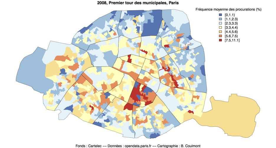 En 2008 à Paris, le recours aux procurations est globalement plus faible qu’aux présidentielles de 2007 et 2012. Mais le 5e arrondissement s’avère spécifique : un combat serré y opposait Jean Tibéri – déjà mis en examen pour une affaire, celle des « faux électeurs » (qui ne concernait pas les votes par procuration) et maire d’arrondissement depuis 1983 — et Lyne Cohen-Solal (à qui, au second tour, manqueront 225 voix pour être élue maire de l’arrondissement). Dans le 5e les bureaux de vote ont vu, lors de ces élections, de nombreuses procurations, plus que dans les autres arrondissements de Paris. Le recours à la procuration est peut-être plus fréquent en cas de combat serré, dont l’issue dépend de la mobilisation de quelques dizaines d’électeurs. Mais dans le 5e, quatre bureaux de votes apparaissent en bleu foncé sur la carte : ils ont indiqué qu’il n’y avait eu aucun vote par procuration. L’association, dans le même arrondissement, de bureaux de vote « à nombreuses procurations » et de bureau « sans aucune procuration » peut susciter l’étonnement car aucun autre arrondissement central de Paris ne montre cette spécificité. Il sera instructif d’obtenir le nombre de procurations aux municipales de 2014.