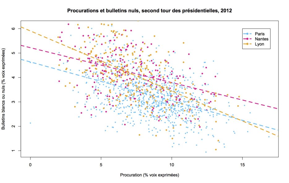 Pour les villes de Paris, Lyon et Nantes, le graphique suivant permet de remarquer, à l’échelle des bureaux de vote, la relation négative entre la proportion de votes par procuration et la proportion de votes blancs et nuls. Plus la procuration est fréquente, moins les votes blancs et nuls le sont.