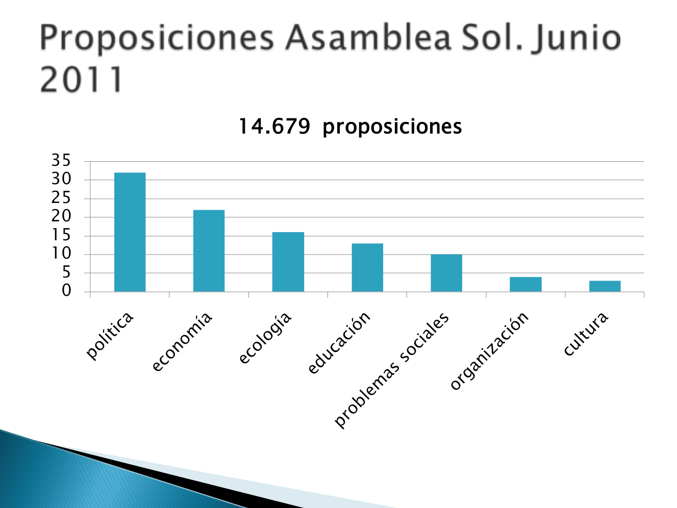Ainsi que le montrent les propositions recueillies par l’assemblée de la Puerta del Sol (Madrid), le mouvement du 15M avait aux premiers jours une orientation fondamentalement démocratique, même si le libéralisme y était résolument critiqué [2].