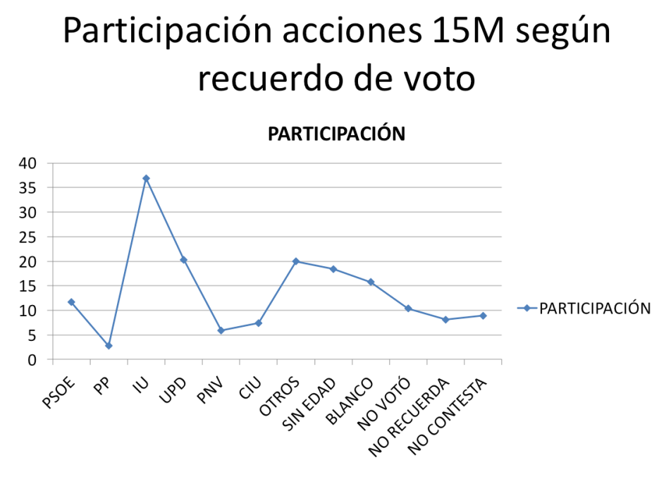 Parce qu’il s’attache en priorité aux problèmes démocratiques, le mouvement reçoit des appuis hétérogènes sur le plan électoral. La participation au mouvement concerne essentiellement des électeurs de IU [ndt : Izquierda Unida, parti émanant de l’ancien PC], UPyD [Union Progrès et Démocratie, parti fondé en 2007 défendant avant tout la transparence démocratique], des électeurs d’autres partis, des personnes trop jeunes pour voter et des gens qui votent blanc (au total, 8,1 % des électeurs interrogés déclarent avoir participé aux premières mobilisations, ce qui donne une idée de leur ampleur) [3].